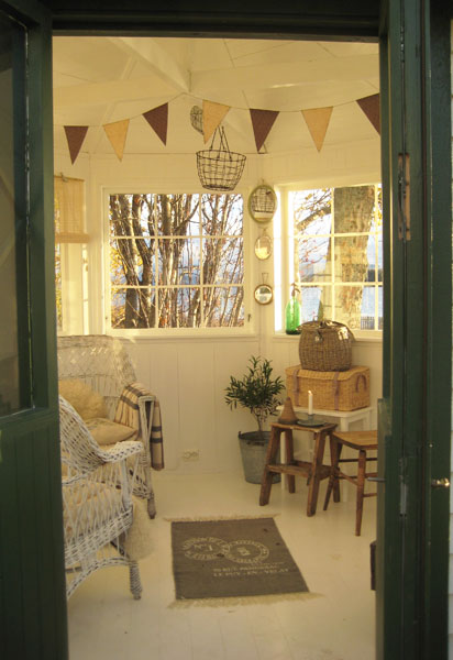 Du har det så utruligt koselig og fint der inni lysthuset,flotte vimpler og herlige detaljer og den grønne døra er så flott:)